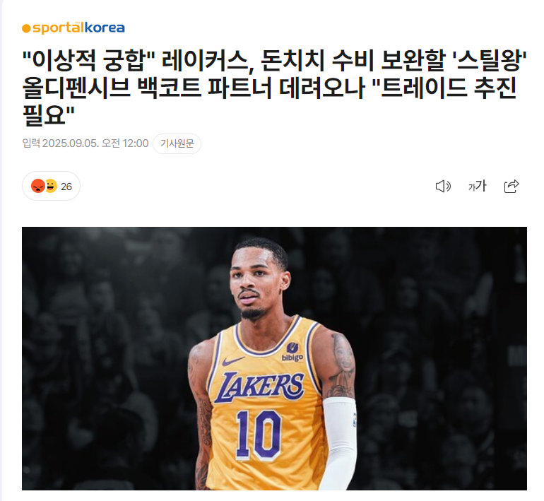 北京时间9月5日,韩国媒体《SportalKorea》撰文:湖人应该为东契奇交易换来一个最佳的防守搭档。图中的人物就是德章泰-穆雷,穆雷曾入选最佳防守阵容,他也是联盟最顶级的抢断者。