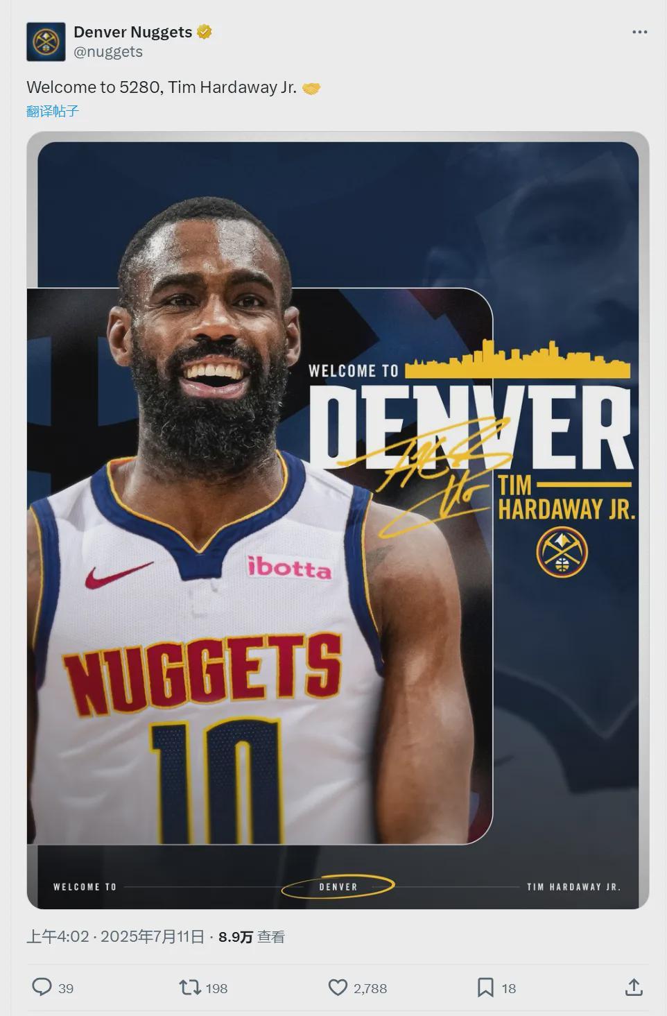 北京时间7月11日上午,掘金官方宣布,球队正式签下小蒂姆-哈达威。根据此前报道,这是一份1年363万美元的老将底薪。小哈达威此前的合同是4年7500万美元,今年夏天到期。他出生于1992年3月16日,33岁的年纪也不算大。